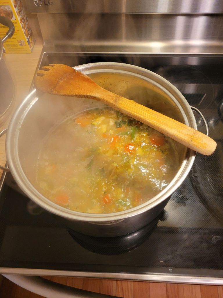 This one started as they all do, with EVOO and a chopped onion. Then, a lot of celery. Then some red, orange, and yellow sweet peppers. Then some garlic. Carrots, zucchini, spices, salt, pepper. Some green beans. Then the leftovers from a roasted chicken, including the “liquid gold” pot drippings, aka chicken fat.
